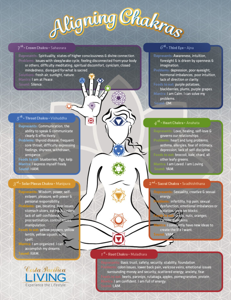 Chakras are defined as the concentrated energy centers of the body. Chakra is a Sanskrit term and it means “wheel” or “disk”. Chakras are spinning wheels of energy/light. It is said that when we are at dis-ease we may be experiencing a dis-balance of our chakras. There are ways to identify, clear and align chakras. Below you will find mantras, foods to eat and signs of imbalance in each chakra.